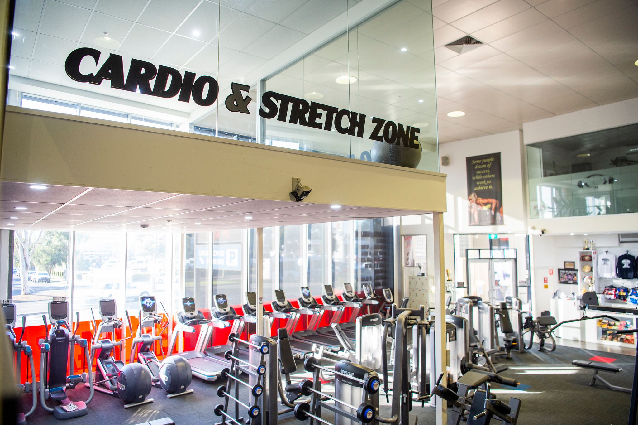 Upstairs stretch room with matted flooring to spread out on. Dedicated cardio machines including rowers, cross trainers and stationary bikes for intense workouts.