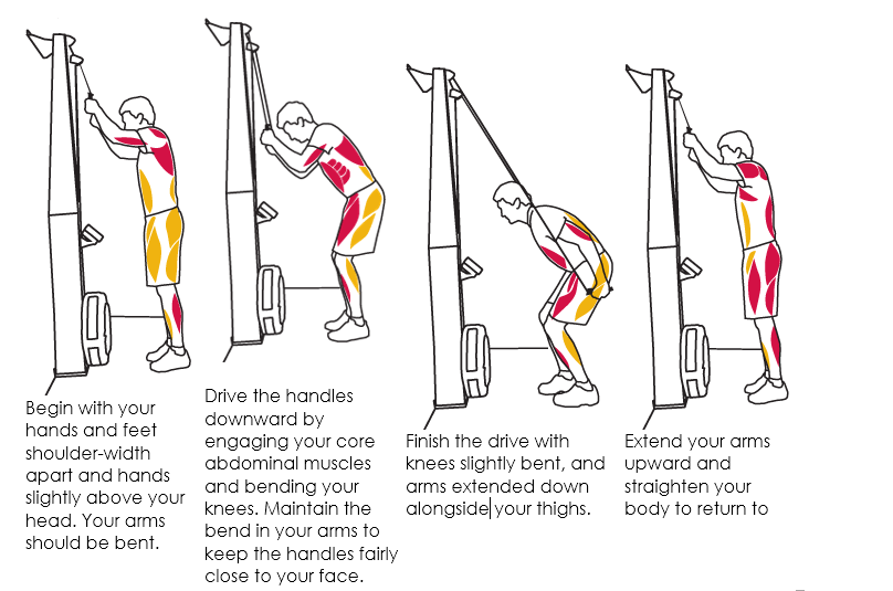 | Begin with your hands and feet shoulder-width apart and hands slightly above your head. Your arms should be bent. | Drive the handles downward by engaging your core abdominal muscles and bending your knees. Maintain the bend in your arms to keep the handles fairly close to your face. |